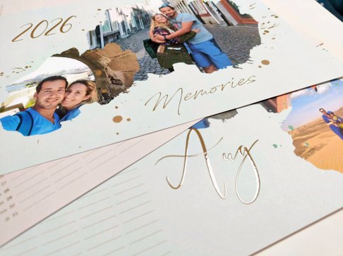 I chose a family calendar with a gold finish. I was able to personalize each page with our best couple photos and choose the starting month. I love the result: elegant, special, and a reflection of our shared past.